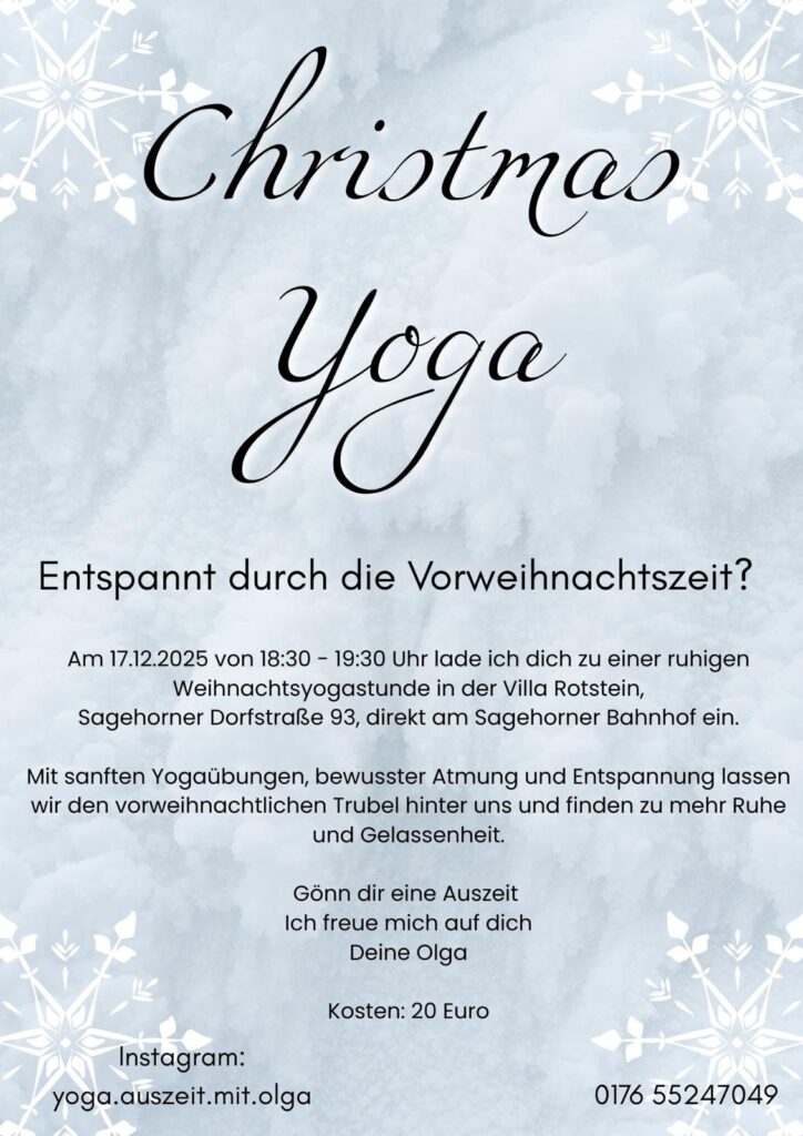 Am 17.12.2025 von 18:30 – 19:30 Uhr lade ich dich zu einer ruhigen Weihnachtsyogastunde in der Villa Rotstein, Sagehorner Dorfstraße 93, direkt am Sagehorner Bahnhof ein.